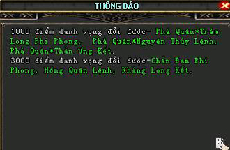 Khi đoạt được số điểm danh vọng nhất định, người chơi sẽ nhận được 1 trang bị lục cấp 100.