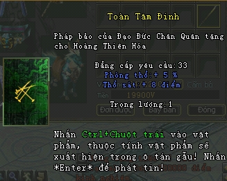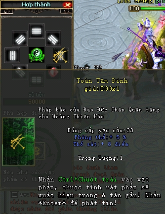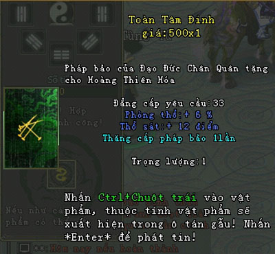 Ví dụ : Muốn thăng cấp Toàn Tâm Đinh, người chơi cần phải chuẩn bị các nguyên liệu sau: